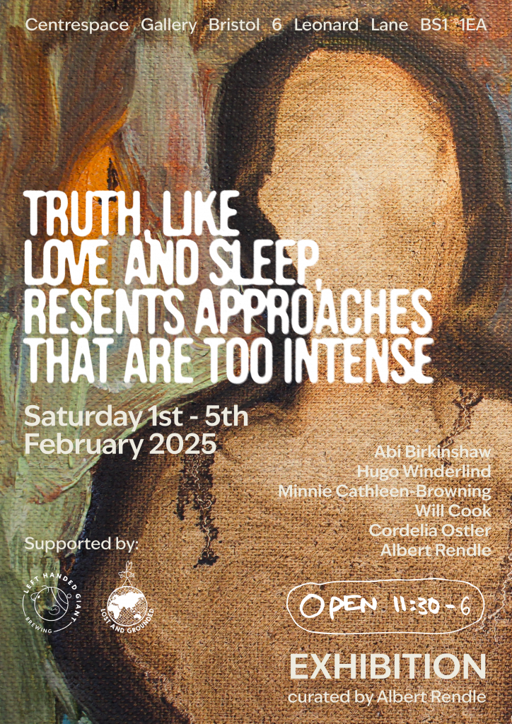 My most recent exhibition ‘Truth, like love and sleep resents approaches that are too intense’ took place at Centrespace Gallery and contained a selection of paintings related to the idea of approaching a subject through skirting means.
